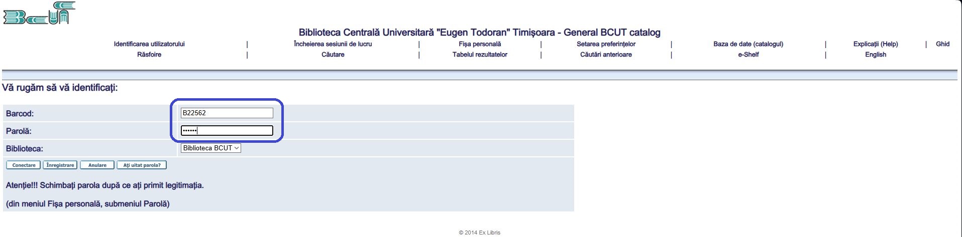2. Introduceți barcodul inscripționat pe cardul de bibliotecă în ambele casete de identificare (barcod și parolă). După prima identificare este indicat ca utilizatorul să-și schimbe parola.