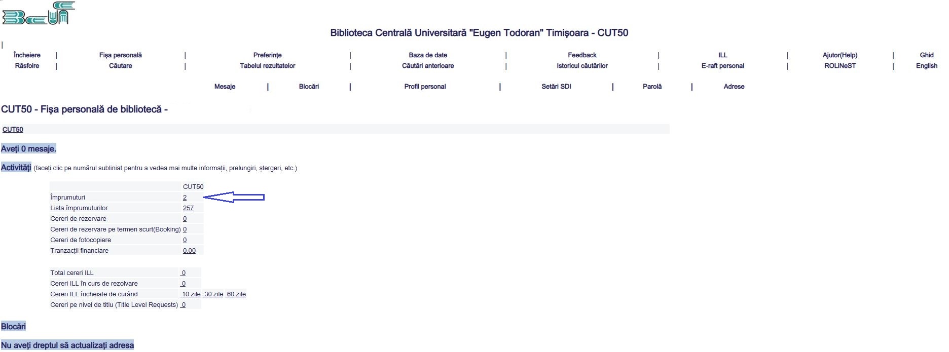 3. După identificare, prin accesarea opțiunii Fișa personală veți avea acces la toate informațiile privind activitatea dumneavoastră în bibliotecă (împrumuturi, lista împrumuturilor din trecut, cereri de rezervare, tranzacții financiare etc.)