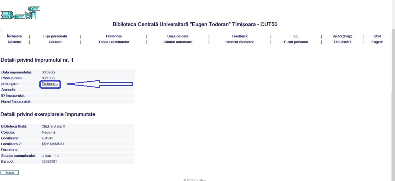 Noul termen de împrumut se calculează de la data efectuării prelungirii, acesta respectând termenul de împrumut al publicației (1 zi sau 14 zile).