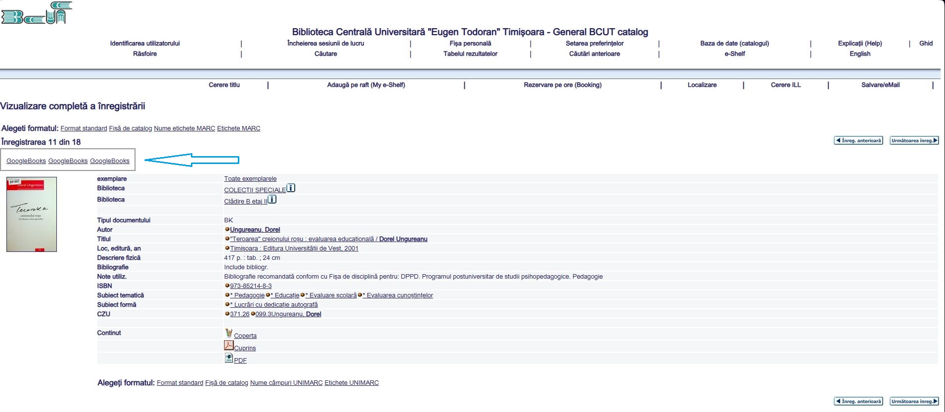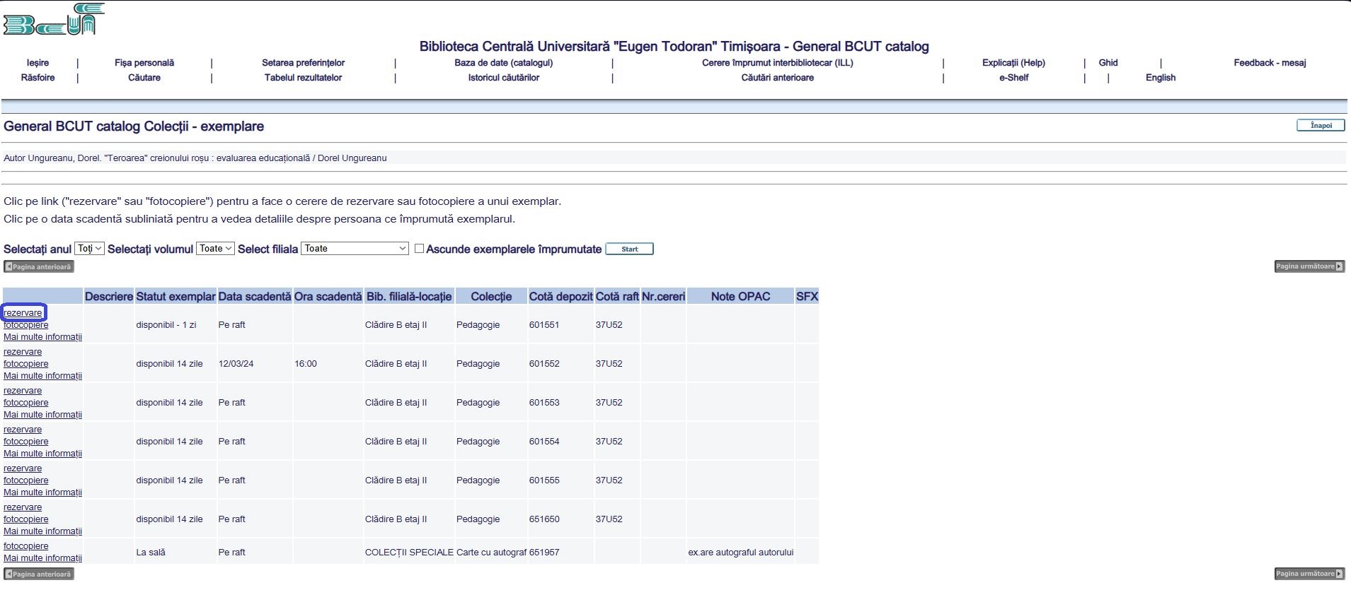 7. Se plasează o cerere de rezervare printr-un click pe informația rezervare din coloana din stânga din dreptul exemplarului dorit.