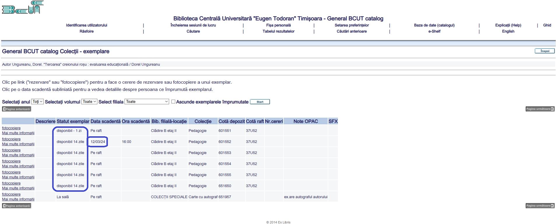 6. Sunteți atenți la informațiile de pe coloana Dată scadentă, pentru a ști dacă rezervați un exemplar liber sau unul pentru care trebuie să așteptați restituirea. Sunteți atenți la informațiile de pe coloana Statut exemplar, pentru a ști perioada posibilă de împrumut.