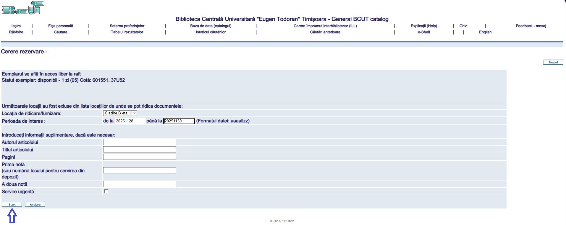 8. Se completează formularul pentru cerere de rezervare (Atenție! – nu este obligatorie completarea câmpurilor cu ”informații suplimentare”) și se dă click pe butonul Start: